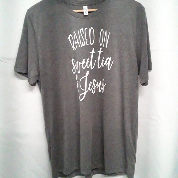 Heather Grey tee with the phrase Raised on Sweet Tea and Jesus in white on it.