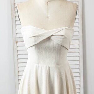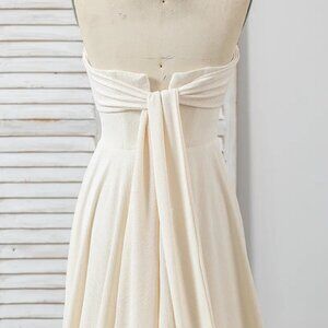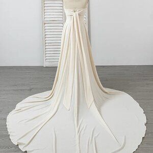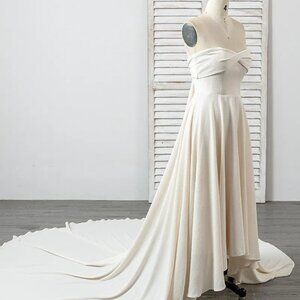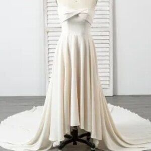 I had this dress custom made based off of Tara Latours "pearl" dress. Fabric is a lightweight fabric with a bit of stretch. "Light apricot" is the color which is an off white, or subtle cream. Cut it tea length if front with a train. I was going to where this as the reception dress but went in a different direction so its never been worn!