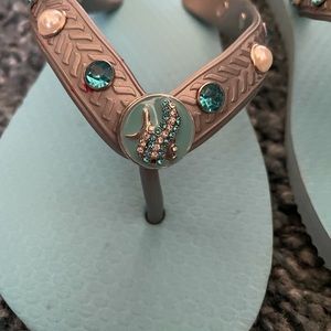 The centerpiece has a fish and then there are rhinestone and pearls set into each shoe up the thong portion