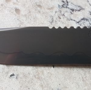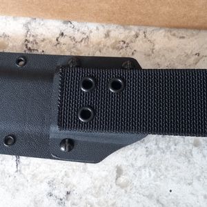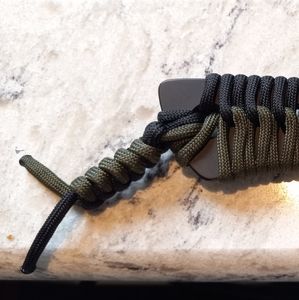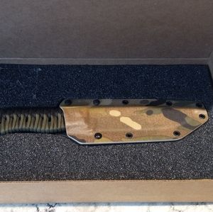 Details: W2 High carbon steel clay hardened blade .190 thick with Harmon. Tang is slightly tapered. Handle is a combination of OD green/black 550 paracord with graphite black cerakote underneath to protect knife tang from corrosion. Kydex sheath in multicam and black. Knife has never been used or carried. Been in my office displayed for the past few years. Decided to part ways with it. Mint condition.