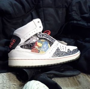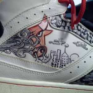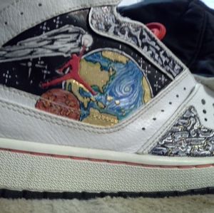 Hand designed leather Jordans 45 hours into artwork fused with 22 k gold leaf one of a kind one shoe left blank for your favorite year ,player, your name or maybe championship rings your choice
