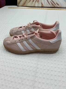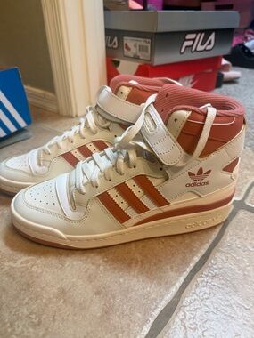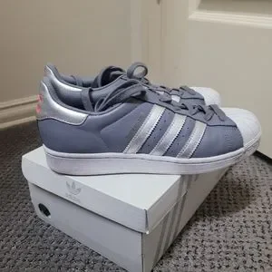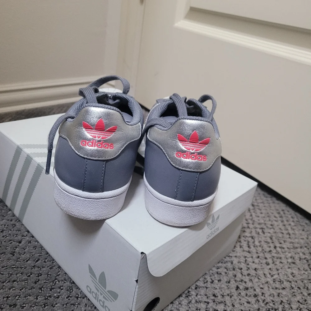 grey with silver stripes, hot pink logo and white soles. Mi Adidas custom design. have been worn a few times but still have box and duster bag. Superstars run a little big. I normally wear an 8 but these size 7 fit.