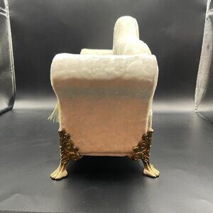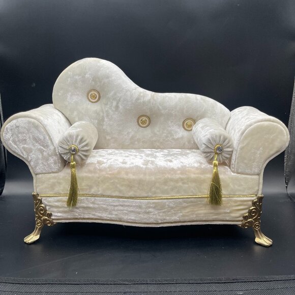 A custom-made chaise lounge for Barbie. Crushed velvet in ivory with gold accents. Hand made by an artist. NIB and has never been used or displayed. *** Only the chaise lounge is for sale, the Barbie is for size purposes