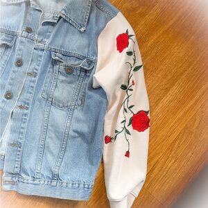 Custom made Denim Jacket with Floral Sweatshirt Sleeves