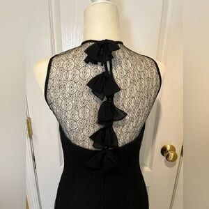 This is a stunning custom made Reggie Brown black evening gown. I could not find any information on this gown or designer however there is a shop that does custom dresses with this name. There is no size tag but the measurements are - bust 17”, waist 36”, length 54”. My best guess is size 4/6 but please use measurements. Smoke free hone.