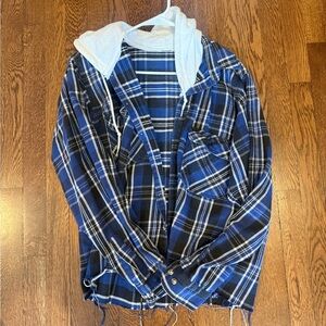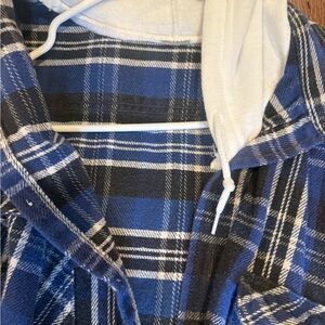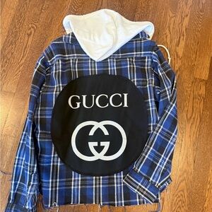 Blue plaid shirt with white hood. Large black circular GUCCI patch and white double-G emblem on back. Casual, bold designer detail.