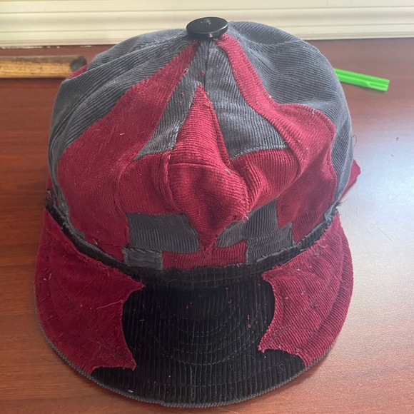 Custom made hat. Cap. With bill. Button top. Gray maroon and black corduroy. Hand made. This is not perfect. There are flaws. Everything is obo bundle and save