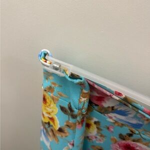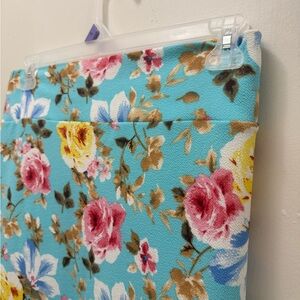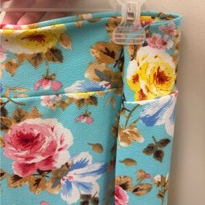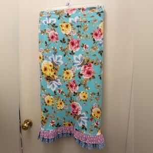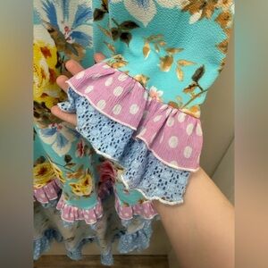 Charming floral dress with vibrant ruffles and bell sleeves. Features a colorful floral pattern on a blue background.
