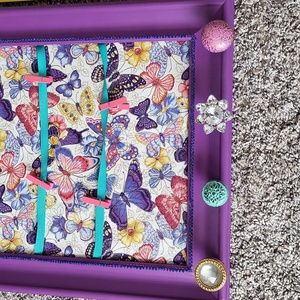 missing a crystal. Purple painted frame with beads. Butterfly material. teal ribbon with pink clothes pins to hold pictures. measurements in pictures. hangs on wall.