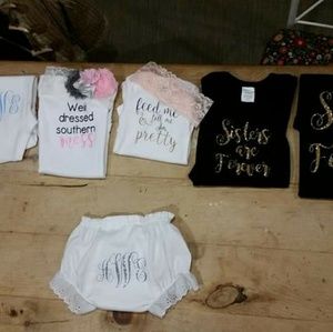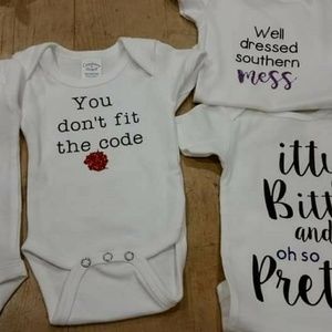 Customizable onesies, sets, any clothing item you can imagine, I can make! Prices vary on individual orders 💖 choose any font, color, saying size and pattern!
