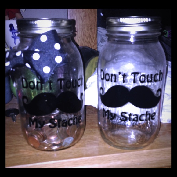I do custom decor any style color theme purpose size style bottle jar lids center pieces chalk board white board even color chalk and white board to glowing to soap dispenser salt shakers everything prices vary on order as these take a lot of time despite how they look lol n supplies are costly.... Don't touch my stache him or her or both any color even add to it if you want sm $14 lrg $18