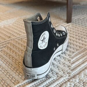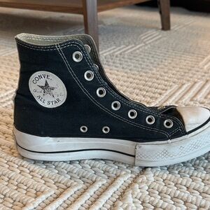 Stylish black high-top sneakers with white soles. Perfect for casual wear. Just need laces!!