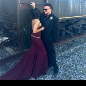 Custom made prom dress by Sonique Stephen Corset made into dress Gold And Burgundy beading around waist line and bust. Very Long V line Train WORN ONCE