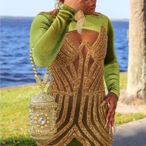 • @letsgetglammed_ beautiful green velvet appliqué gown