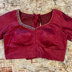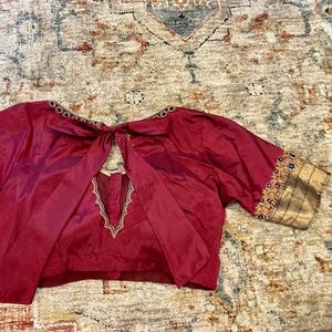 Custom made red silk choli blouse. Perfect to pair with a saree or lehenga. Hand sewn maggam work in royal blue and gold. Sleeves hit just above the elbow and are trimmed in gold. Opens to the front with hook closures. Bust pads sewn in. Stunning custom designed back with keyhole and large bow that ties at the top. Will fit bust size 38-40C or size XL in Indian women's clothing.
