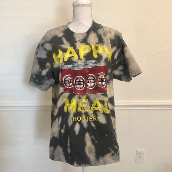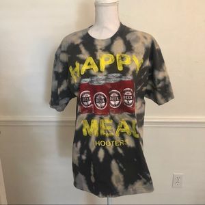 Custom bleach dyed hooters shirt • “happy meal” six pack graphic • men’s large, fits as oversized women’s • super cute with biker shorts • custom dyed, washed and dried • 100% cotton •