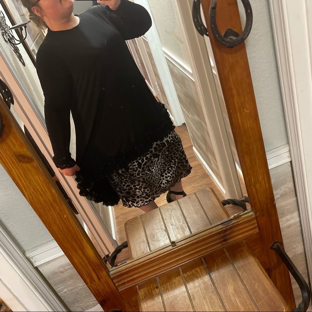 Purchased and only worn once. Just didn’t like the fit on me, it’s absolutely beautiful!!! Lace ruffle trim on the hem of the shirt and lace on the bottom of the sleeves.