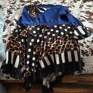 Super cute Royal blue custom top with polka dot, stripes, and leopard print! Lace high low bottom