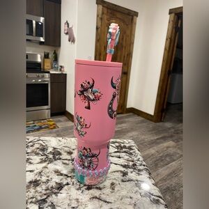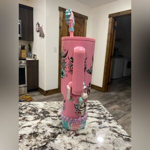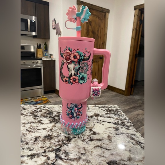 Stylish pink insulated tumbler with floral bull skull artwork. Features a comfortable handle and decorative charm for a personalized touch. Durable design ideal for everyday use and travel. Vibrant pink color adds a fun, feminine accent. UV DTF transfers hand wash only! Comes with accessories bracelets made by me. I did use this one once!