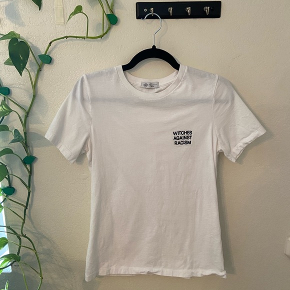 Handmade cross stitched tee shirt. “Witches against racism”