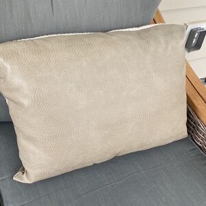 Unique neutral colored accent pillow in fabric and faux leather. In EUC. Used for staging only.