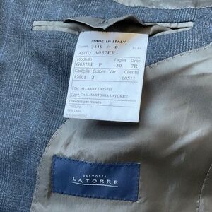 Custom-made Italian men’s wool suit from Sartoria LaTorre. The fully lined suit jacket is size 50 (Italian/European sizing), with 25” sleeve and 29” collar/hem. The fully lined pants are size 50 (Italian/European sizing), with 32” waist, 28” inseam (with 2 1/2 “ to let out). The pattern is blue plaid with fine light blue line. The suit is in pristine condition and recently dry cleaned.