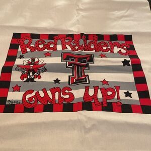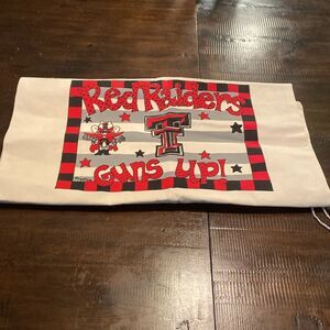 Canvas drawstring bag with Red Raiders Guns Up design. Features red, black, and white colors. Measurements are approximately 24”x35” would make a great gift for someone starting at Texas Tech filled with laundry stuff