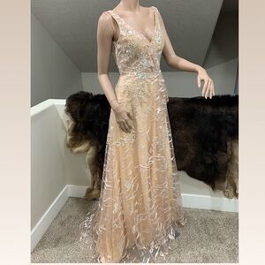 Extremely high quality gown, very elegant and refined. Exquisite embroidery lace mesh fabric with shiny rhinestone beads and sequins.