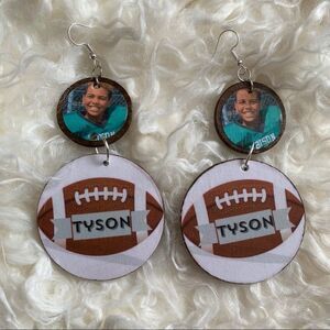 Cute wood earrings handmade by me. These will be customized with your child’s picture and last name/number. These are finished in a walnut stain. The top circle is a little over 1” in diameter and the bottom circle is 2”. THEY ARE STILL LIGHT WEIGHT! The top contains a little picture of your player. The picture that you email me must NOT BE COPYRIGHTED! By sending me the picture, you are agreeing that it is not copyrighted and I am NOT responsible. Email TrendyTrinkets4u@yahoo.com