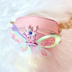 Custom Butterfly Iridescent Purse with Blythe Doll Embellishment.. Zip closure with gold paperclip style chain strap. The first 2 pics erased the background and part of the chain. The chain is perfect.