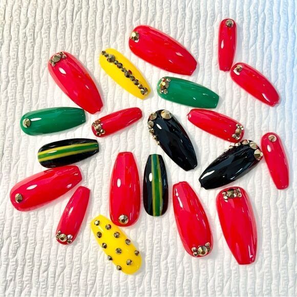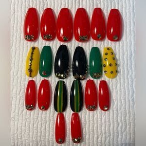 Red, black, green, and yellow mix and match gel nail set with rhinestone designs. See all photos for details. This set includes:
