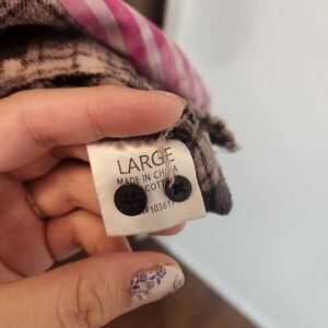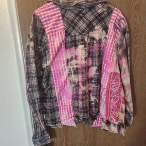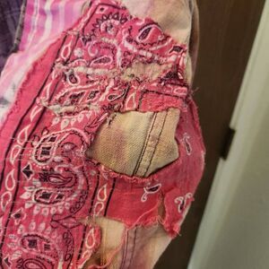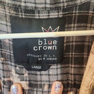 Custom distressed button-down grunge-style plaid shirt. Blue Crown base. Size large.