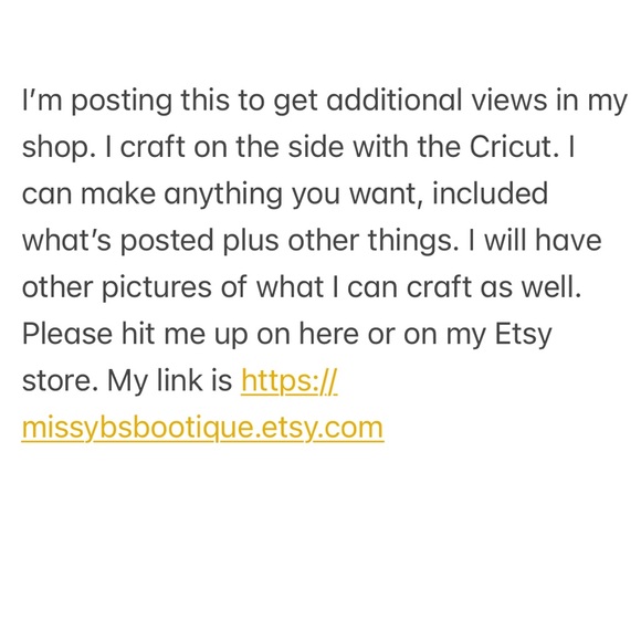 I craft on the side with the Cricut. I can make anything you want, included what’s posted plus other things. I will have other pictures of what I can craft as well. Please hit me up on here or on my Etsy store. My link is https://missybsbootique.etsy.com
