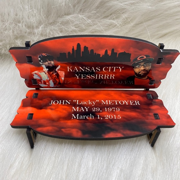 These mini memory benches & rocking chair can be customized any way you desire. The bench is 7in x 4in (barbie doll size). The rocking chair is 3in x 4in (barbie doll size). These mini wood knocks will be a great gift. You can place them on a coffee table, end table or on a fireplace mantle.