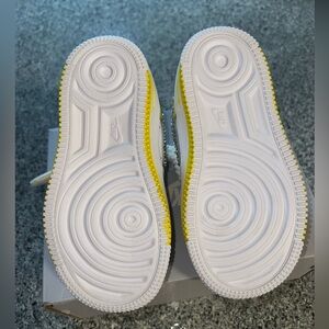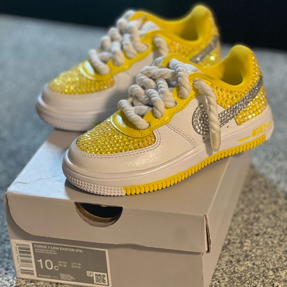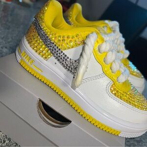 As you can see, these shoes are BRAND NEW and were originally just all white air force 1s with ELASTIC SHOESTRINGS (something new they do for kids shoes ๐ I had to cut the elastic out of the shoe) but I decided to put my own spin on them. This is my very first time doing this project and I feel they turned out really cute ๐. However, I will be charging for my time and effort put into painting, bedazzling, drilling holes for the rope laces, and more.