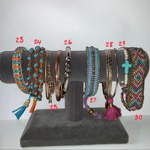 28: multi piece dainty gold bangles with “S” charm and maroon tassel