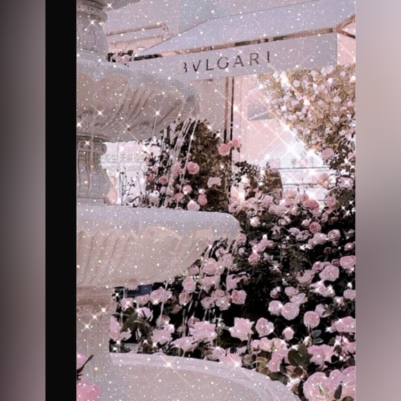 Elegant Bvlgari display with pink floral accents. Perfect for luxury decor inspiration.