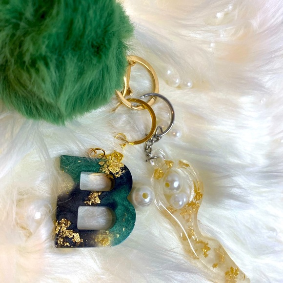 Beautiful Emerald green, Gold, Black, and Pearl customized initial defense keychain.