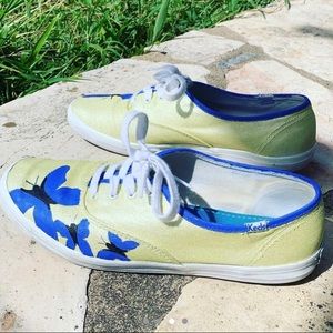I took a pre-loved pair of white keds, painted a coat of a sparkly, gorgeous yellow and added some beautiful blue butterflies. They are lightly worn and still in excellent condition.