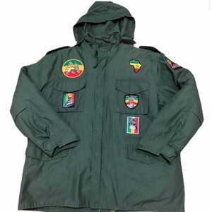 The M-65 Jacket features a concealed hood, heavy brass zipper and snaps up storm flap