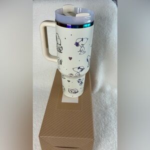 Stanley Quencher H2.0 FlowState 40 oz white/cream tumbler featuring a beautiful aftermarket engraved custom Snoopy & Woodstock design. Perfect for Peanuts fans. The base, model stamp, and packaging are all genuine Stanley — the artwork was added by a third‑party creator, making this a unique and hard‑to‑find piece.
