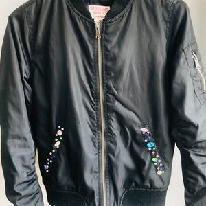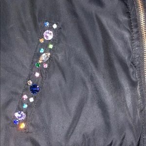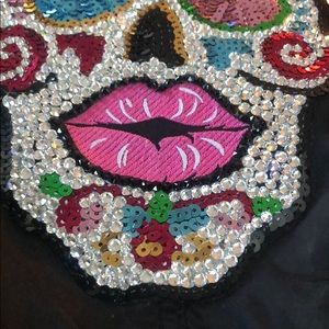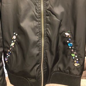 This jacket has been given a makeover. It’s a mossimo jacket size S and has been customized with a sequins and Swarovski crystal skull design. Each crystals was placed one by one. The flowers have been sewn on by hand. On the front of the jacket the crystals were also sewn on by hand.