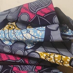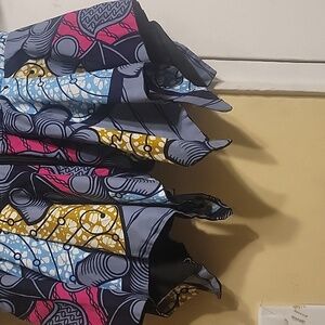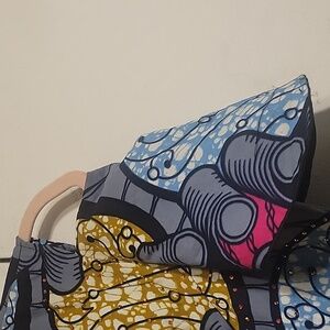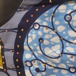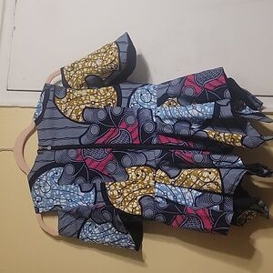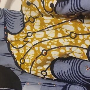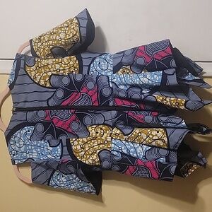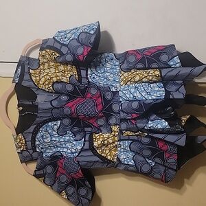 Vibrant- Custom Made Peplum cold shoulder top with a unique pattern. Features shades of blue, yellow, fuchsia, white, and black.