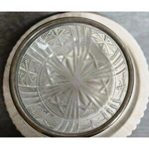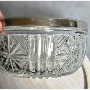 This vintage cut glass bowl is a stunning piece that will add elegance to any occasion. Made in England, this bowl features an etched design and a silver plate rim. Measuring 8 inches in diameter and 4 inches in height, it is perfect for all occasions, whether it is a holiday dinner or an elegant dining experience. Crafted from high-quality glass, this bowl is a vintage original from the late 20th century. It is a one-of-a-kind item that is perfect for collectors. The bowl is clear with a silver-lined rim, giving it a sophisticated and timeless look. It is perfect for those who appreciate the art deco style and vintage design.