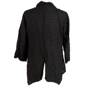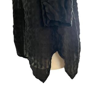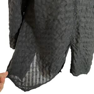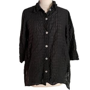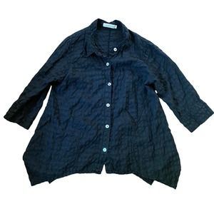 Button front top in a black semi-sheer linen seersucker. Hem has points on the sides and the mid back has a deep slit. Would look fabulous over leggings or Jeans.