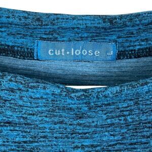 Cut Loose asymmetric hem, long sleeves, round neckline. Marled spaced dye pattern throughout. A thicker fabric with stretch. 57% viscose, 41% polyester, 2% lycra. Size large