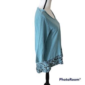 Turquoise colored tunic with high low hem and 3/4 sleeves. Has a beautiful floral cutout design at the hem. It is a cotton/linen blend. In excellent pre-owned condition. Size M.