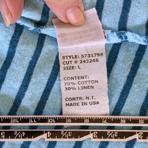 Nearly new cotton/linen A-line T-shirt dress by Cut Loose. Light sky blue with darker blue stripes. Fabric is fresh and little worn. Photos 2-7 are truest to color.