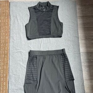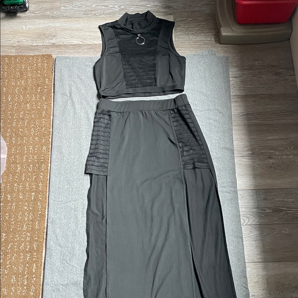 Both top and skirt are size small. Both are stretchy material (95% polyester & 5% elastane)