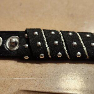 black studded suede and silver thread on faux black leather bracelet. This is an Original 30 Day Bracelet by Meskell. Cut a bad habit out of your life or add a good habit one day at a time, one thread at a time. For each day you are successful in doing so, you cut a thread from the bracelet. At the end of the 30 days, you will have a bracelet with the iconic scissor charm to showcase your achievement.